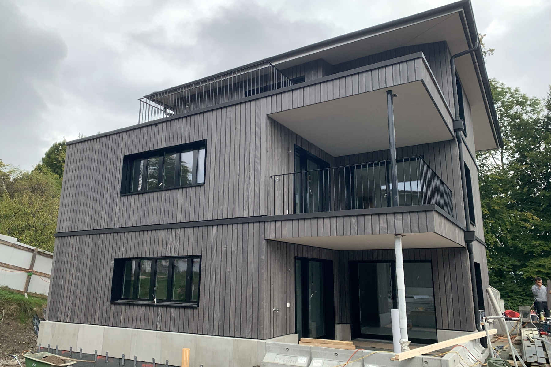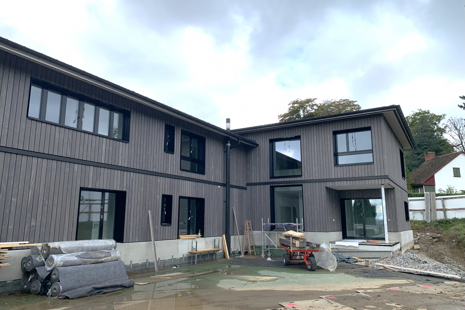 Zwischen Oktober und Mitte Dezember 2024 konnten wir die vier Häuser etappenweise aufrichten. Es folgte der Innenausbau, die Fassadenbekleidung aus Holz sowie Terrassenholzdecks aus Accoya.